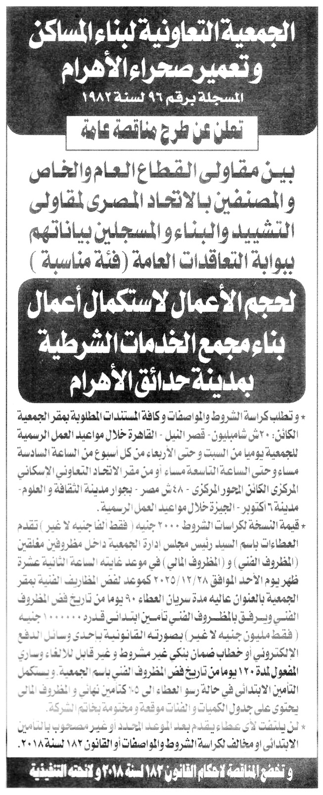 استكمال أعمال بناء ومجمع الخدمات الشرطية بمدينة حدائق الأهرام– تامين ابتدائي 1000000 جم – تسحب كراسة الشروط من مقر إدارة المشتريات مقابل 3000 جم – وقد تحدد جلسة فتح المظاريف يوم 28/12/2025 | download |