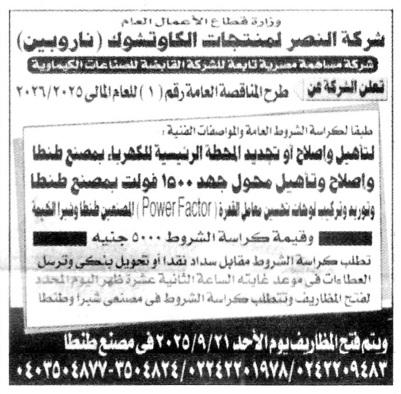 | مناقصة | شركة النصر لمنتجات الكاوتشوك طنطا ت: 0403504877 |