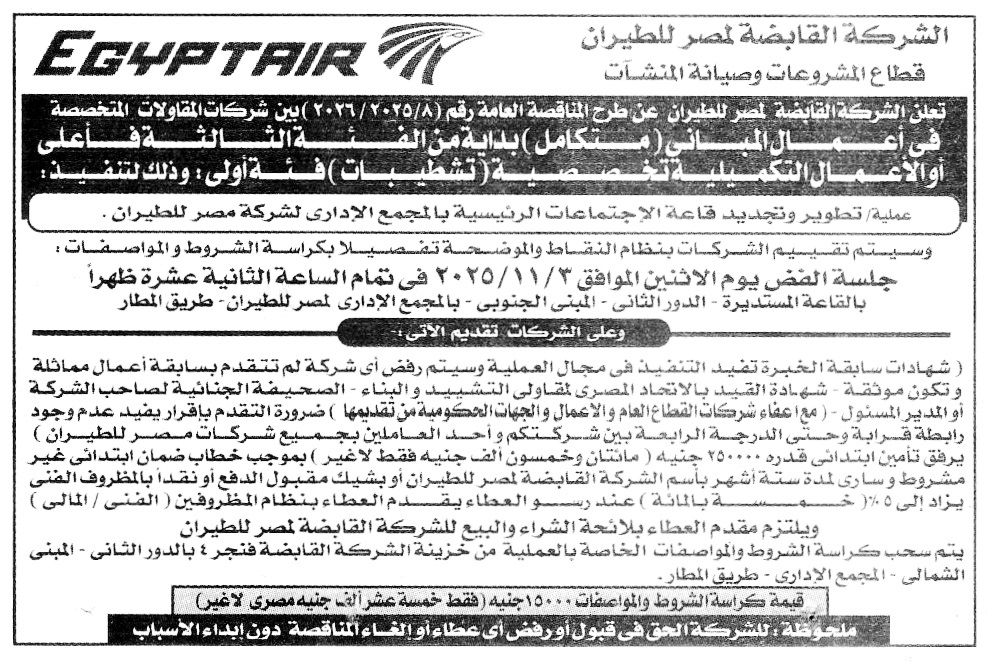 تنفيذ عملية تطوير وتجديد قاعة الاجتماعات الرئيسية بالمجمع الادارى لشركة مصر للطيران – تامين ابتدائي 250000 جم – تسحب كراسة الشروط من مقر إدارة المشتريات مقابل 15000 جم – وقد تحدد جلسة فتح المظاريف يوم 3/11/2025 | download |