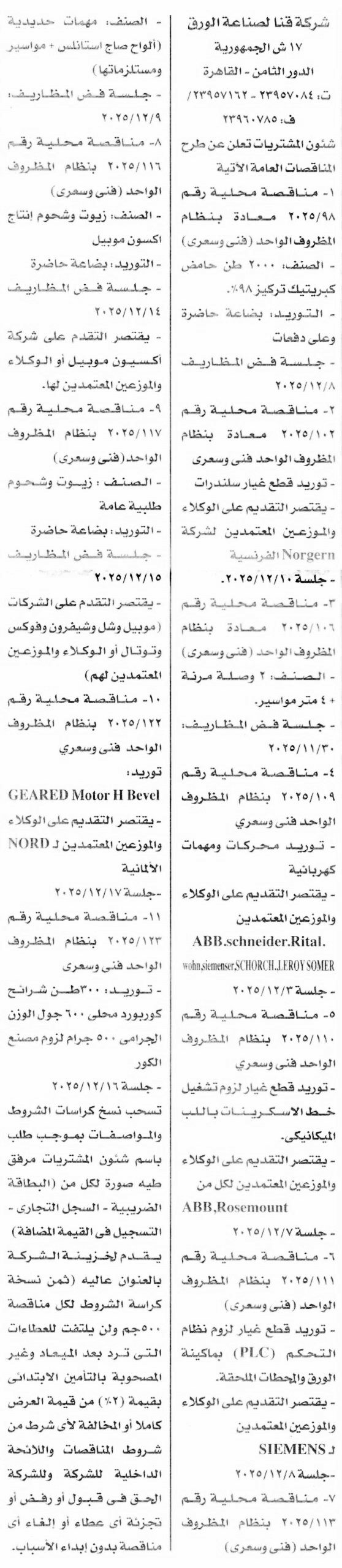 توريد 300طن شرائح كوربورد محلي 600 جول الوزن الجرامي 500 جرام لزوم مصنع الكور- تامين ابتدائي 2% جم – تسحب كراسة الشروط من مقر إدارة المشتريات مقابل 500 جم – وقد تحدد جلسة فتح المظاريف يوم 16/12/2025 | download |
