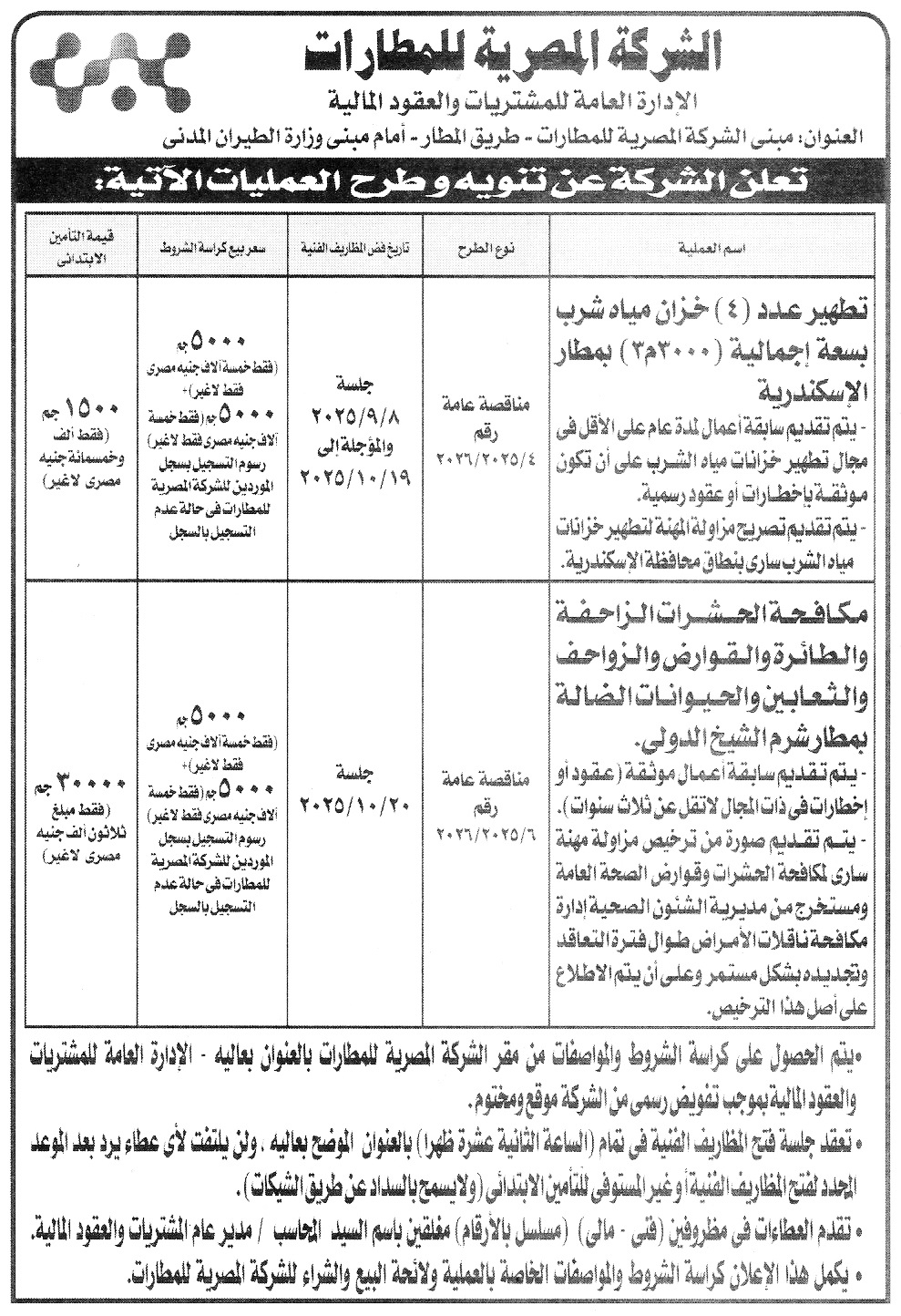 عملية تطهير عدد (4) خزان مياه شرب بسعة إجمالية (3000م2) بمطار الاسكندرية – تامين ابتدائي 1500 جم – تسحب كراسة الشروط من مقر إدارة المشتريات مقابل 5000 جم – وقد تحدد جلسة فتح المظاريف يوم 19/10/2025 | download |