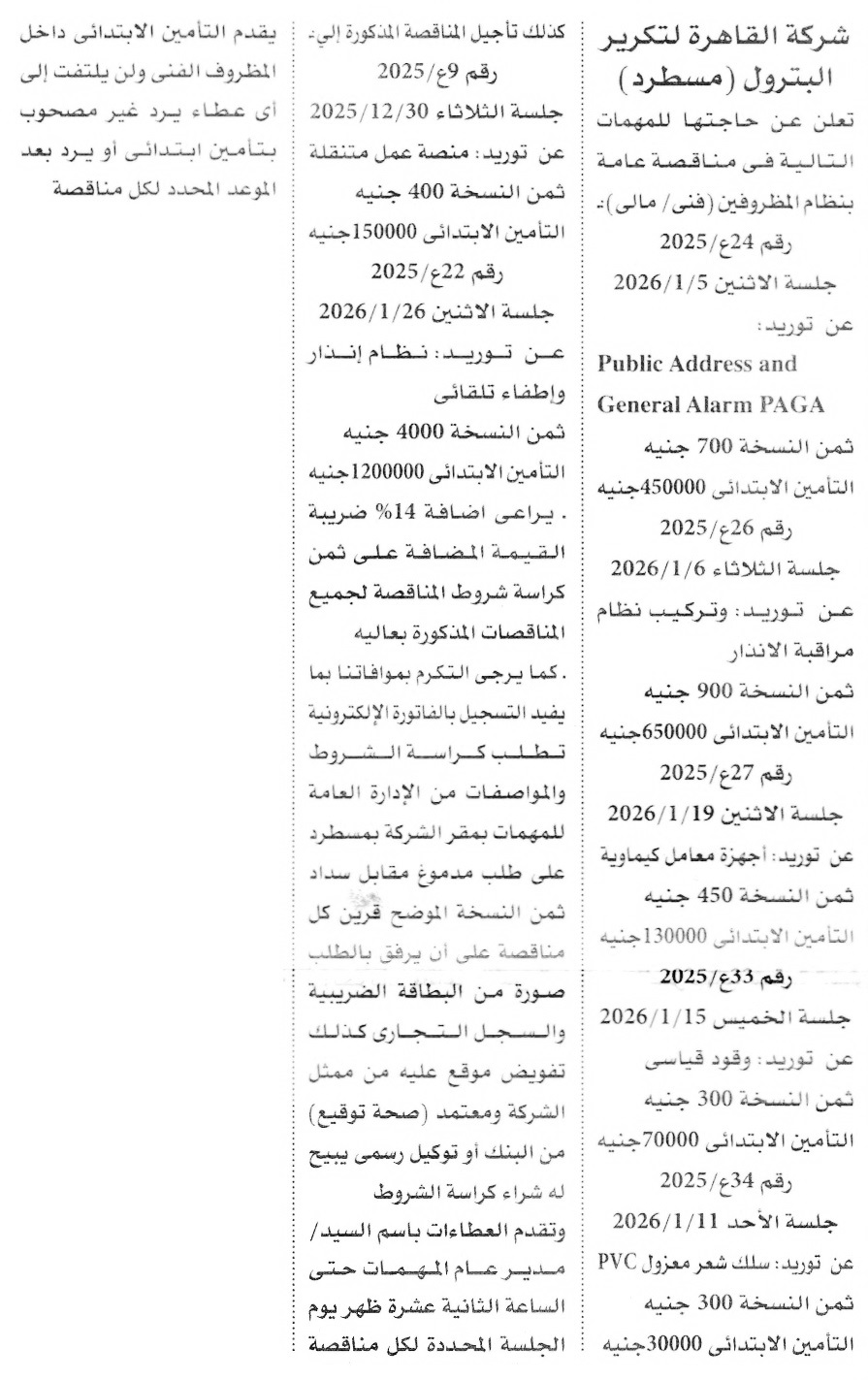 توريد نظام: Public Address and General Alarm (PAGA) –  تامين ابتدائي 450000 جم – تسحب كراسة الشروط من مقر إدارة المشتريات مقابل 700 جم – وقد تحدد جلسة فتح المظاريف يوم 5 / 1 / 2026 download