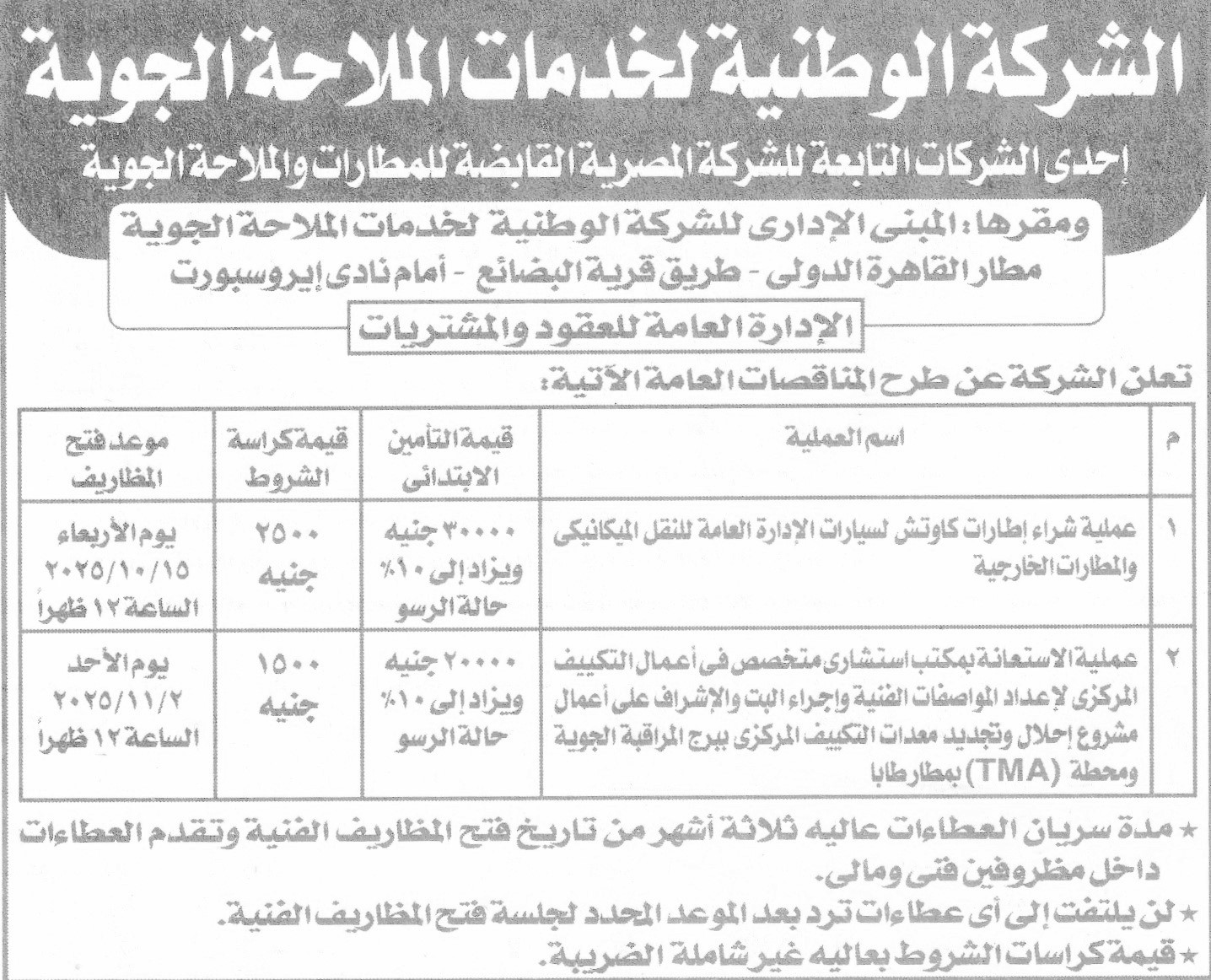 عملية الاستعانة بمكتب استشارى متخصص فى أعمال التكييف المركزى لإعداد المواصفات الفنية واجراء البت والاشراف على اعمال مشروع احلال وتجديد معدات التكييف – تامين ابتدائي 20000 جم – تسحب كراسة الشروط من مقر إدارة المشتريات مقابل 1500 جم – وقد تحدد جلسة فتح المظاريف يوم 2/11/2025 | download |