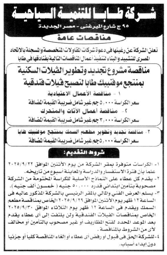 تنفيذ عملية تجديد وتطوير الفيلات السكنية بمنتجع موفينبيك طابا(الاعمال الاعتيادية – تامين ابتدائي 50000 جم – تسحب كراسة الشروط من مقر إدارة المشتريات مقابل 3000 جم – وقد تحدد جلسة فتح المظاريف يوم 30/9/2025 | download |